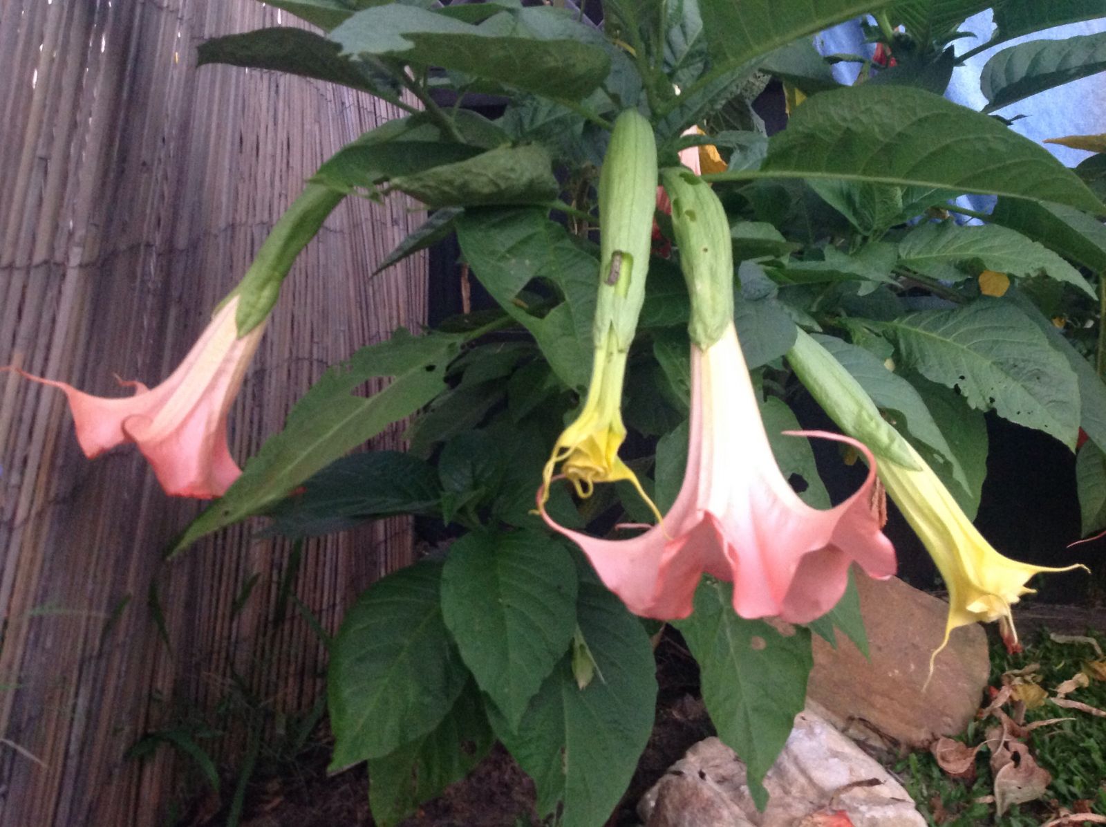 My brugmansia which I got as a cutting a couple years ago is flowering constantly. Nice colours too. But I keep getting these little fat catipillars all over it and they destroy the leaves.