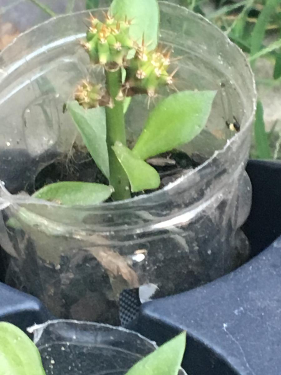 Zelly hybrid seedlings triple grafted. Two seedlings grafted to areoles of Pereskiopsis.