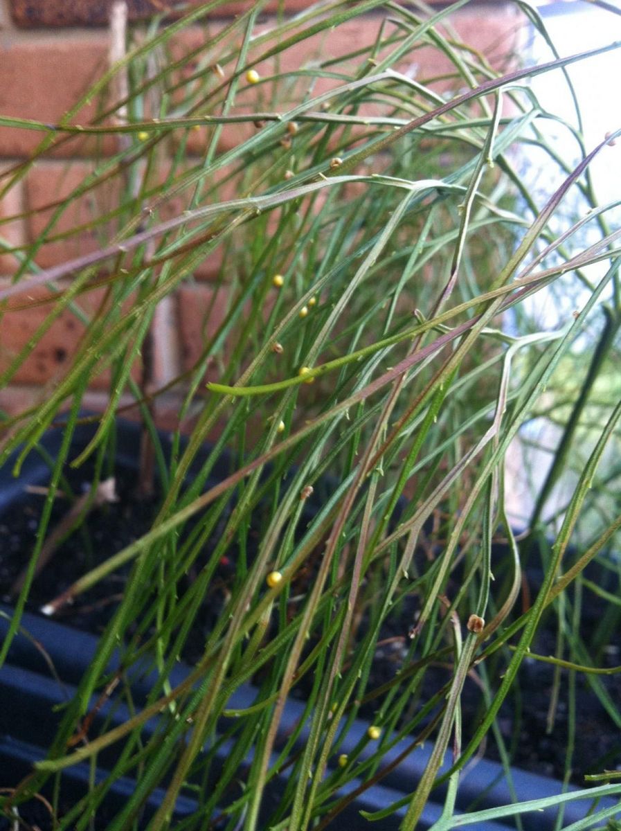 I thought I had this plants identity sorted but I seem to have misidentified it. Anyone have a fix on what it is? It has a small yellow flower about 2-3mm size, a lot like a fern in the way it branches from the soil with a brown fibrous root and small nodes forming just beneath the ground before sending up another branch. I had thought it was a ephedra but it doesn't have the same jointed stems as E.sinica perhaps it's another variety? Yellowish to dark green colour, branchy twig like structure. Would love to find out if I am actually right to it being e.sinica but a a seedling next to it has definite differences, the way it doesn't have a full jointed structure.