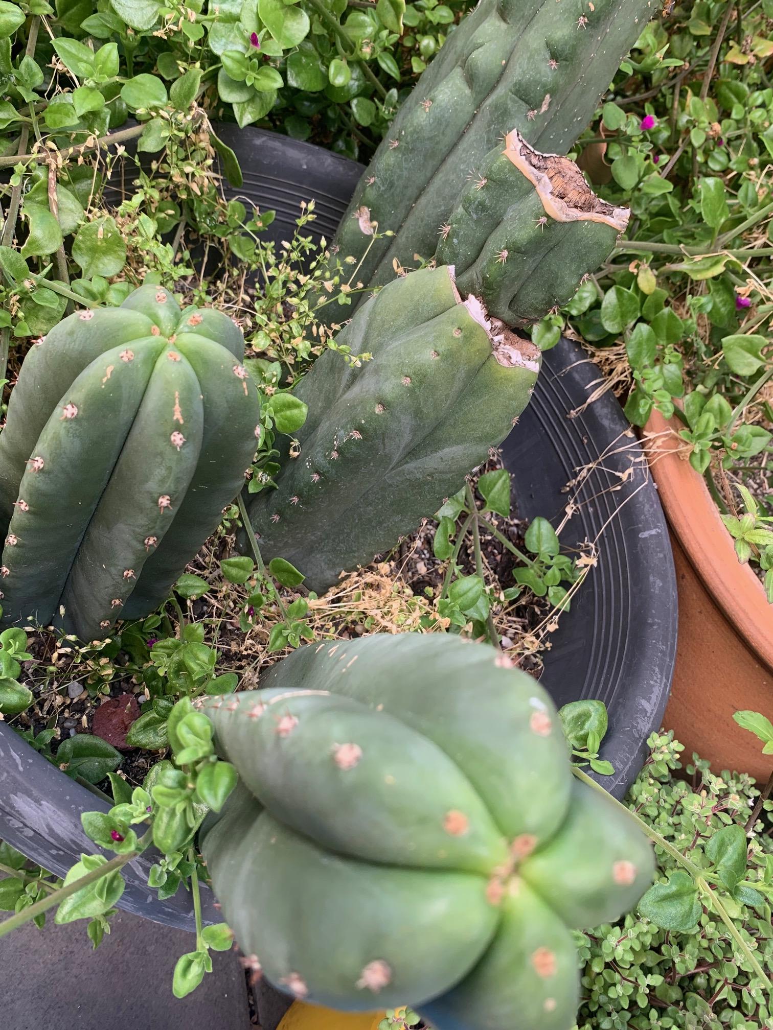 I often just leave them to heal, they'll often start pupping from the damaged tip, which tends to look more natural than if they are cut with a knife. Depends on your aesthetic preferences. For fungal infections I usually wait and see - if the plant is healthy and there's enough biomass/energy in reserve, they can survive infection. You'd want to monitor it carefully, to see if it's spreading. Or you can cut them all nice and clean, that definitely sends a chemical trigger to produce new pups. Never seen a caterpillar that large near my cactus plants. Must be some huge mother moth. Never heard of golden maifan, sounds expensive.