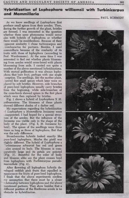 Just to consolidate... Koehres pollinations Lophophora williamsii Huizachex Lophophora koehresii Lophophora williamsii x Lophophora fricii Lophophora williamsii x Lophophora fricii f2 Lophophora koehresii x Lophophora fricii Lophophora koehresii x Lophophora diffusa Lophophora fricii El Amparox Lophophora koehresii Lophophora fricii x Lophophora diffusa Lophophora diffusa x Lophophora koehresii Kada Lophophora diffusa x Obregonia denegrii Other hybrids as per http://www.magicactus.com/lw_jourdaniana.html and other sources Lophophora williamsii x Mammilaria bocasana Lophophora williamsii x Mammilaria zeilmanniana Lophophora williamsii x Mammilaria Strombocactus disciformis Lophophora williamsii x Turbinicarpus pseudomacrochele Lophophora williamsii x Ariocarpus fissuratus Lophophora williamsii x Astrophytum asterias Lophophora williamsii x Epithelantha micromeris Lophophora jourdaniana Lophophora jourdaniana var. mammilaris Now, much of what I have found did not include locality information for specimens used in these crosses nor did they always include whether the specimen chosen was a self-fertile or not. Also note, there is not much information to be found on how these pollinations occurred. Was the flower emasculated first? Was a donor pollen or mentor pollen utilized? Was a cut style approach used? Given that often it is possible for a particular phenotype to be dominant over another was the cross carried out further to the f2 or even backcrossed to help bring out the recessive traits or was it just assumed the cross was successful without further breeding of the progeny? Were the progeny sterile thus making an f2 impossible to make?